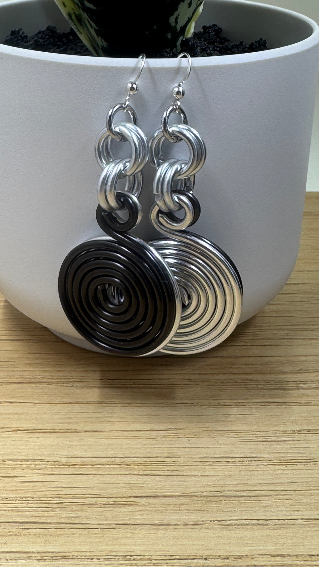 Black and Silver Double Disk Earrings with Sterling Silver Ear Wires